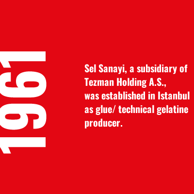 Sel Sanayi Ürünleri Ticaret ve Pazarlama A.S, today known as Seljel Jelatin Sanayi ve Ticaret A. S., has been founded in 1961 as glue/technical gelatine producer from bovine hides. Both companies are subsidiary companies of Tezman Holding, a leading group with its diversified companies in the Turkish business community.