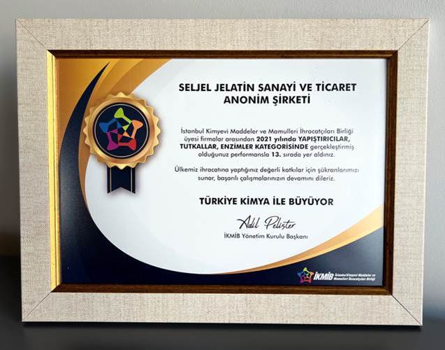 With its performance in 2021, SelJel Gelatin ranked 13th in the 'Adhesives, Glues, Enzymes' category among the member companies of the Istanbul Chemicals and Chemical Products Exporters' Association(İKMİB). We share our happiness and thank our team who contributed to the growth of SelJel.